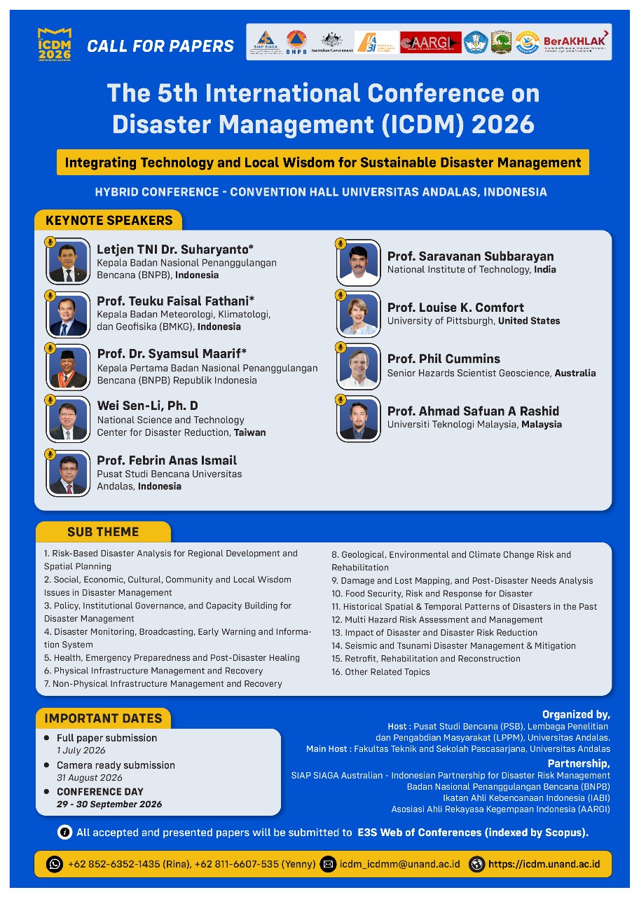 It is our great pleasure to welcome you on the 5th ICDM that will take place from 29 to 30 September 2026 in the Padang City, West Sumatra, Indonesia. In this series, the theme of 'Integrating Technology and Local Wisdom for Sustainable Disaster Management' is addressed from a multidisciplinary perspective, encompassing 16 sub-themes. The more research results, experience and knowledge shared, the wider the network formed, and thus the more effective future disaster management will be.